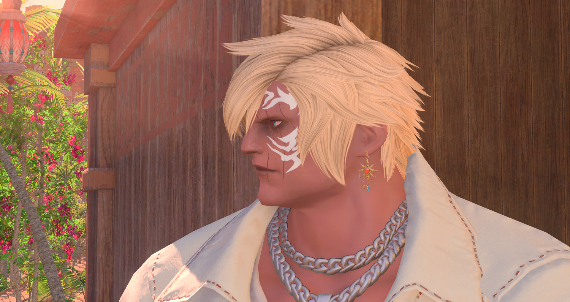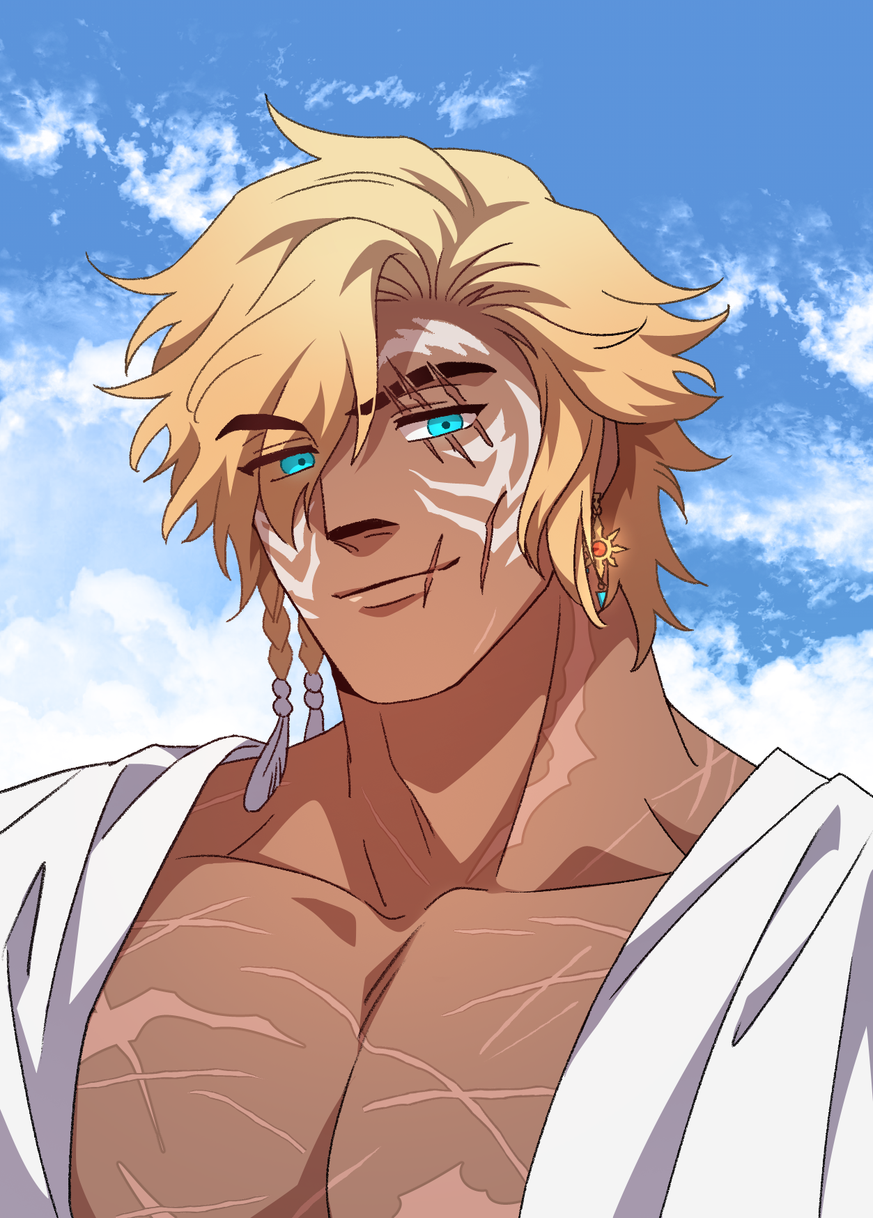 오른쪽 얼굴과 목 뒤를 수북하게 덮고 있으면서 오른쪽 귀 뒷쪽, 두 갈래로 짧게 땋은 머리만큼은 깔끔하게 정돈된 백금발의 머리카락. 청명한 하늘빛 에메랄드를 박아둔 듯한 눈동자, 햇빛에 의해 달궈진 듯한 구릿빛 피부의 얼굴엔 피부새과 대조되는 흰색의 문신이 그려져 있다.
