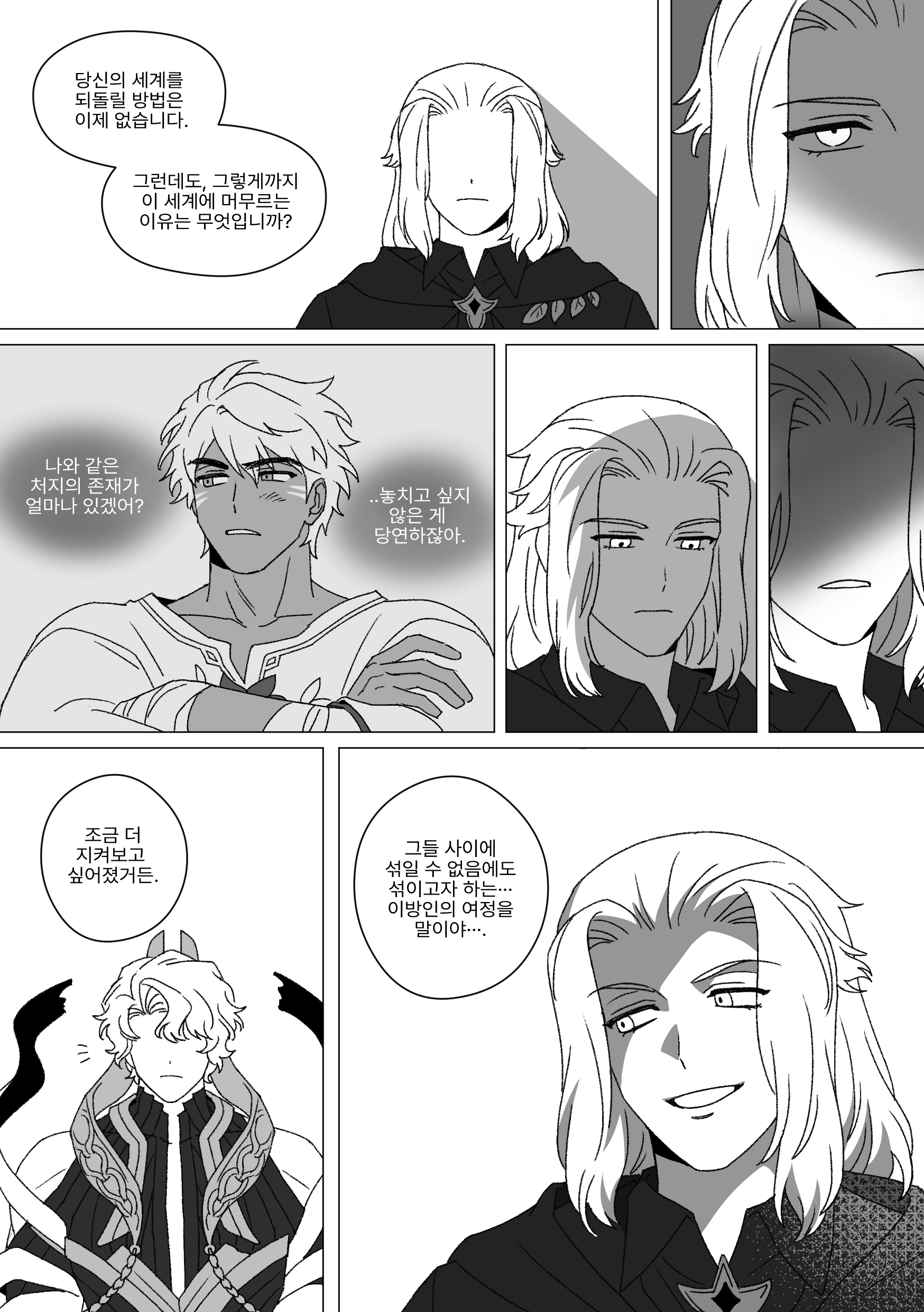 : 종잡을 수 없다고 느낀 신들과 달리 자신이 있을 자리를 찾기 어려운 자신(밀레시안)의 처지와 겹쳐보이기도 했고, 이 이계신 을 소멸시킨다면 자신과 비슷한 존재를 찾긴 더이상 어렵지 않을까 하는 생각에 망설이게 됨, 그리고 이 연민이 결정타를 넣지 못한 이유가 되었다.